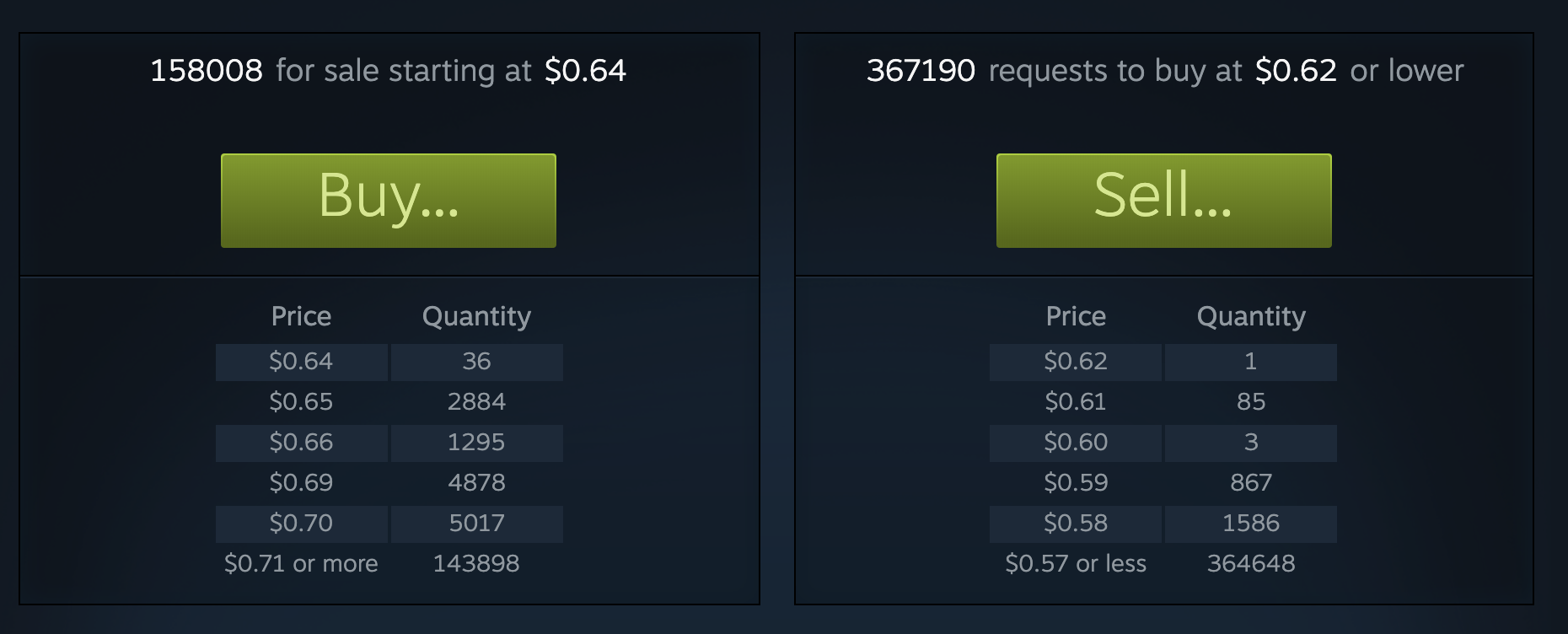 Steam, a popular video game platform, has a Community Market where in-game items can be bought and sold. The market for many virtual items can actually be highly liquid with some item quantities listed in the hundreds of thousands or millions. Steam’s marketplace is centralized and collects a transaction fee of 5% for each item from the buyer to cover fraud incidents and costs of development. This fee could also change in the future. On top of that, games like Team Fortress 2 and Dota 2 take an additional fee of 10% for their items sold.