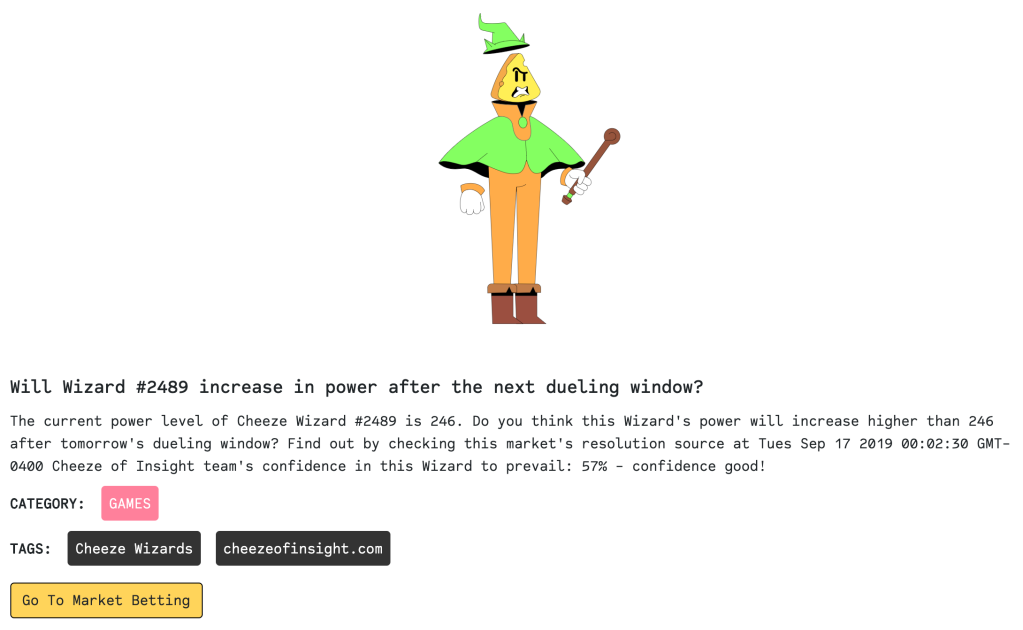 You can also see the amount of creativity from developers at hackathons regarding composability. At the Sep 2019 ETHBoston hackathon, there was a project called SwanDAI that is a synthetic asset created using UMA which is a platform that allows for the creation of synthetics. SwanDAI tracks the deviation of the stablecoin DAI’s price from its dollar peg, enabling people to bet on and hedge against the DAI peg breaking. The Aug 2019 Cheeze Wizards hackathon also had combination of different protocols with gaming. For example, the project Cheeze of Insight combined the game Cheeze Wizards with Augur prediction markets and 0x instant widget to launch daily markets on Augur where users can bet on the outcome of duels in the game.